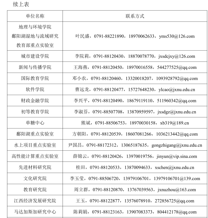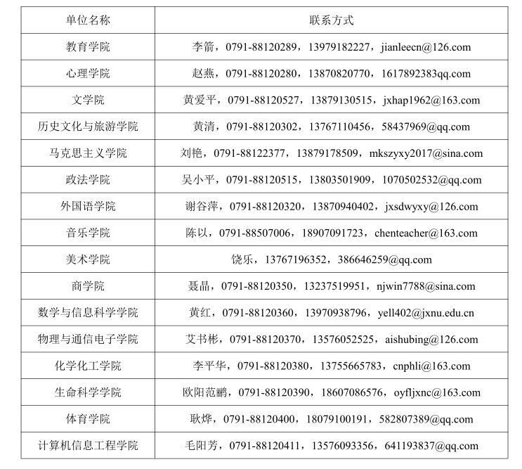 包 包),发送至各学院(单位)联系人邮箱(联系方式详见上表);同时发送至江西师范大学人事处